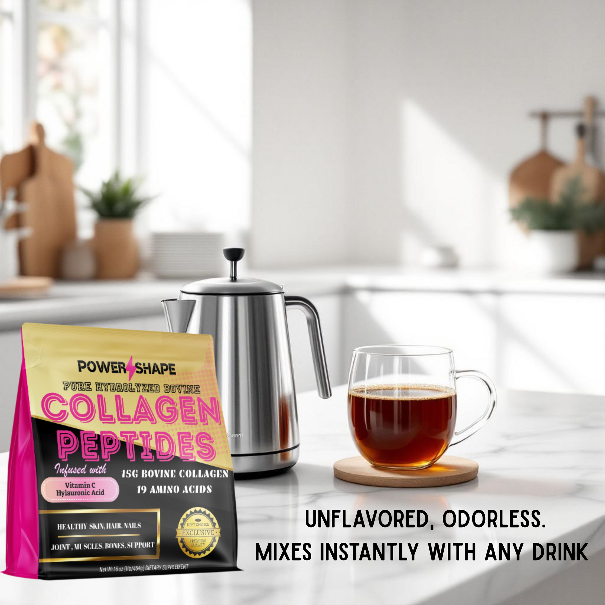 Power Shape Hydrolyzed Bovine Collagen Peptides | Type I & III | With Vitamin C & Hyaluronic Acid | 1lb
